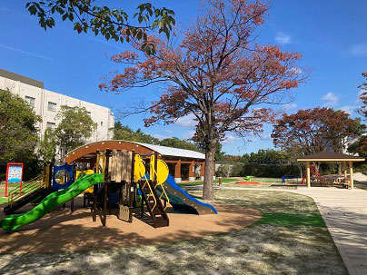 インクルーシブ遊具(障がいがある子もない子も一緒になって遊ぶことができる遊具)や子ども用トイレ併設のバリアフリートイレ、屋根付きの休憩スペースなどを設置し、様々な子どもが安心・安全に楽しく遊べる公園エリアです。