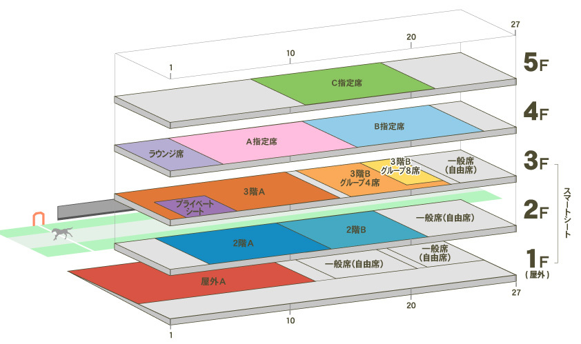 スタンド3階のお一人様用の席となります。背もたれのある屋内席で、コース全体が見渡せるため、障害レースやコーナーなどの様子もしっかりご観戦いただけます。