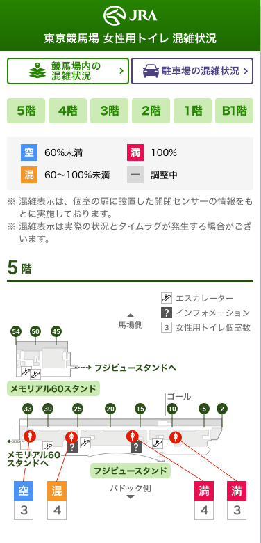 2024年10月より東京競馬場におきまして「スタンド内の混雑状況を表示する実証事業」を行っております。本年の東京競馬開催日も引き続き混雑状況表示サイトから飲食店などの混雑状況をリアルタイムにご覧いただけますので、ぜひお試しください。