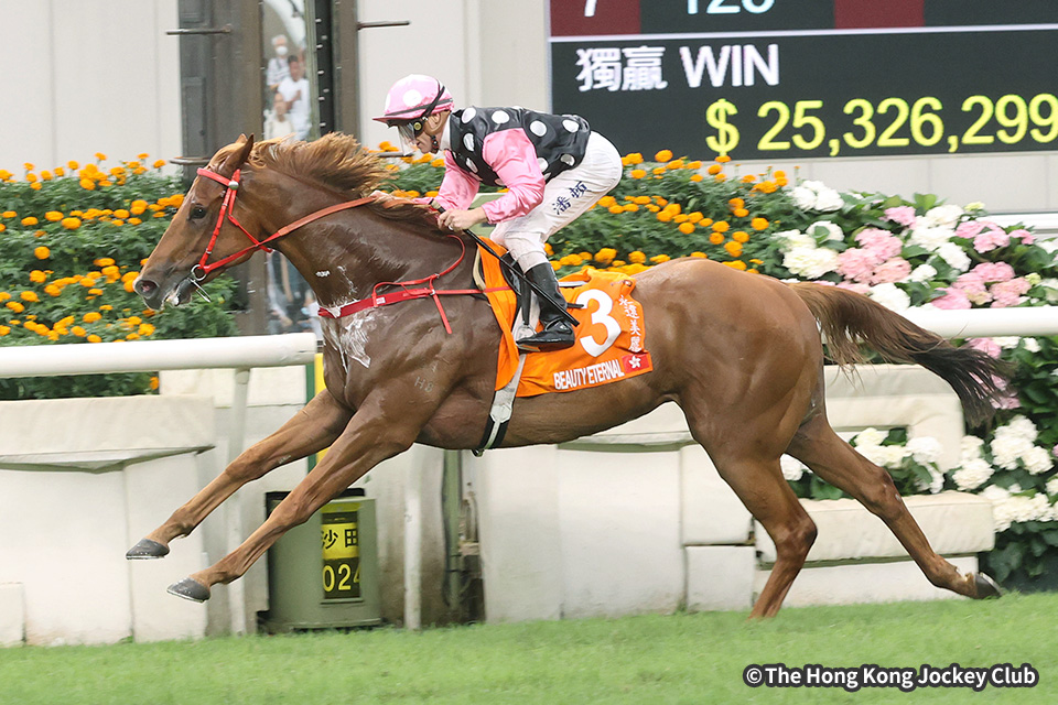 2023年3月の香港ダービー(リステッド・芝2,000メートル・香港調教の4歳馬限定)を優勝。翌2024年1月には香港スチュワーズカップ(G1・芝1,600メートル)を勝ち、続く香港ゴールドカップ(G1)でもロマンチックウォリアーからクビ差の2着に入りました。しかしその後はドバイターフ(G1・UAE)が13着、帰国初戦となったチャンピオンズマイル(G1)は勝ったビューティーエターナルから1馬身3/4差の3着。日本に遠征した6月の安田記念(GⅠ)では17着と大敗してシーズンを終えました。今シーズンは復帰戦となった10月のシャティントロフィー(G2)こそ2着でしたが、続く11月の香港ジョッキークラブマイル(G2・芝1,600メートル)を先行策から制すと、12月の香港マイル(G1・芝1,600メートル)も2番手追走から直線で力強く抜け出して、ソウルラッシュに1馬身1/4差をつけて優勝。今年に入ってからも1月の香港スチュワーズカップ(G1・芝1,600メートル)を8頭立ての4番手から楽々と抜け出してギャラクシーパッチに2馬身差をつけて同レース連覇とすると、続いて距離を延ばした前走2月の香港ゴールドカップ(G1・芝2,000メートル)では3コーナーでつまずいて後方2番手まで下がる場面がありましたが、そこからさすがの脚力を見せて、3馬身3/4馬身差で優勝。連勝を4に伸ばしています。