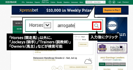右上の検索窓(Horse Nameと書いてある窓)に「arrogate」と入力して「虫眼鏡アイコン」をクリック。