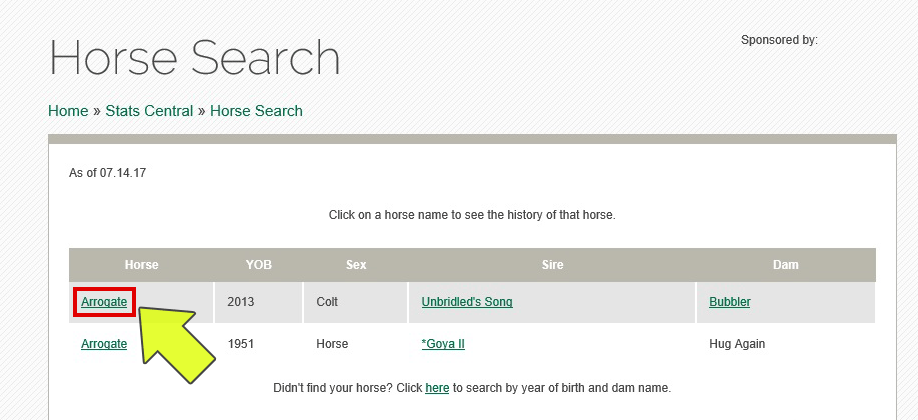 「arrogate」という文字列を馬名に含む馬が表示されます。今回は2013年生まれのArrogateを調べたいので、上の「Arrogate」をクリック。