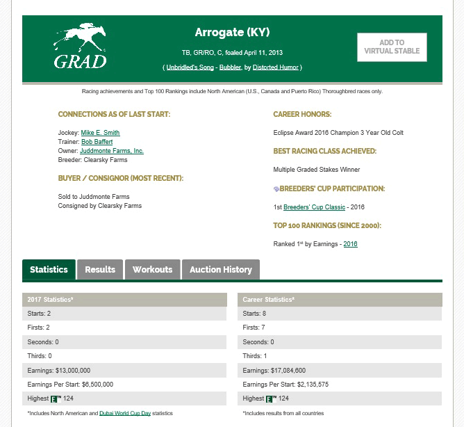 | 9 | CAREER HONORS | 過去の表彰歴(Arrogateは2016年度エクリプス賞最優秀3歳牡馬を受賞) |