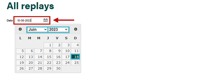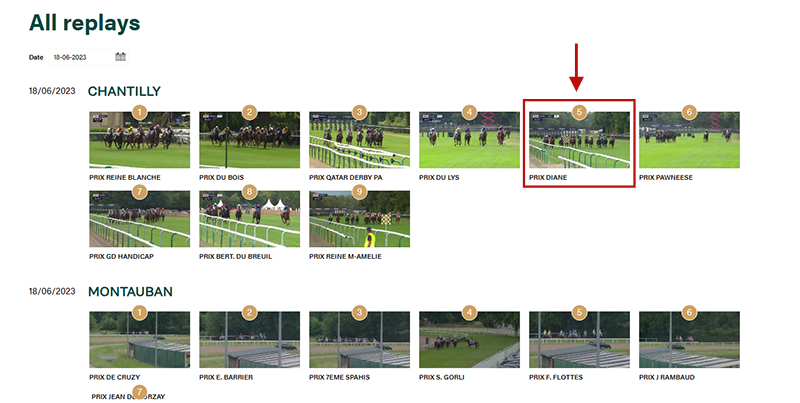 ログインして、左上の Date の窓から、レース映像の見たい年月日(今回は2023年6月18日)を選択。