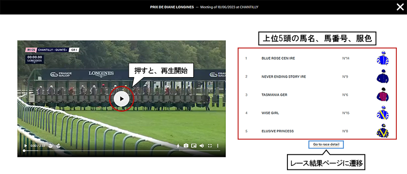 2023年6月18日にフランスで行われた全てのレースが表示されるので、CHANTILLYの5レース(PRIX DE DIANE)を選択。