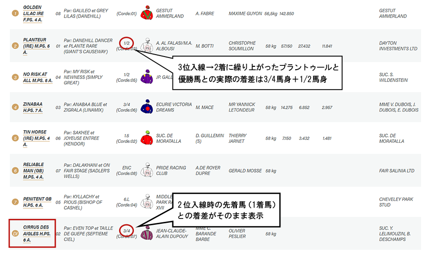 失格、降着があった場合は、変更後の確定着順で成績が表示されます。ただし、着差の欄は、入線時のものがそのまま残るため注意が必要です。