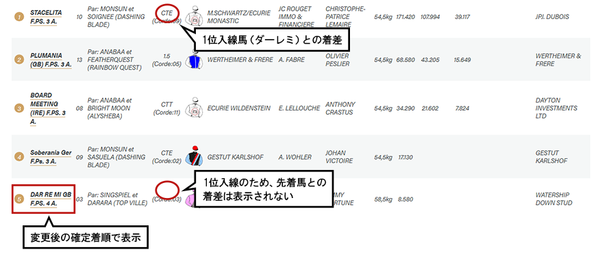 ダーレミの着順は、変更後の確定着順(5着)で表示され、着差の欄には、1位入線のため、先着馬との着差は表示されません。