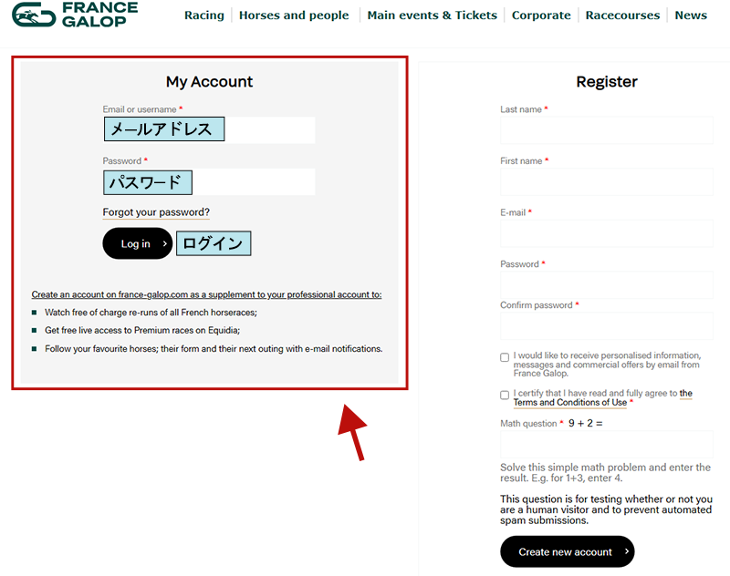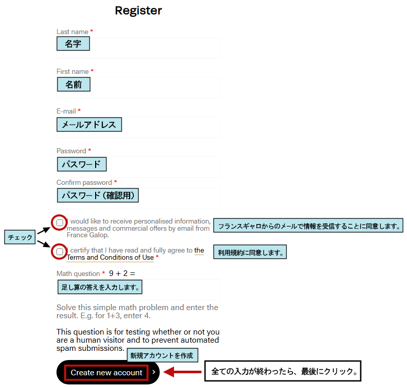 messages and commercial offers by email from France Galop.フランスギャロからのメールで情報を受信することに同意します。 I certify that I have read and fully agree to the Terms and Conditions of Use. * 利用規約に同意します。 Math question * 足し算の答えを入力します Create new account 新規アカウントを作成 -