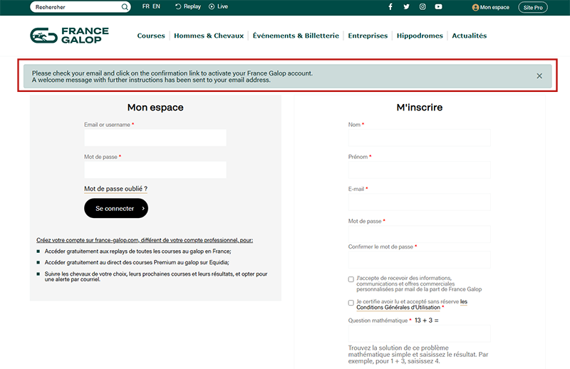 上記のメッセージが表示されたら、登録完了です。登録したメールアドレスには、フランス ギャロから「Confirmation of your e-mail address on france-galop.com」というタイトルのメールが届きます。メール内のURL(http://www.france-galop.comから始まるもの)をクリックすると、「Confirmation of your account activation on france-galop.com」というメールが届きます。これ以降は、ログインしている状態であれば、フランス ギャロ ウェブサイトのレース映像をご覧いただけます。