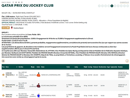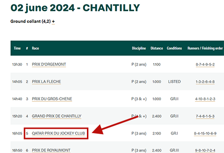 2024年6月2日・シャンティイ競馬場の全レースが表示されるので、5レース「QATAR PRIX DU JOCKEY CLUB」をクリック。