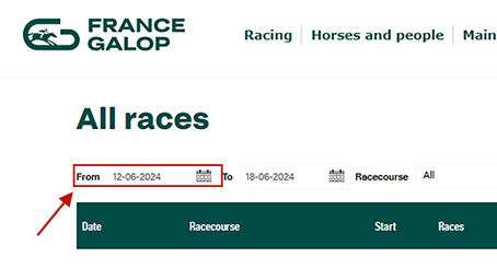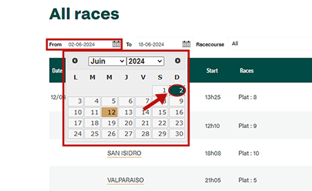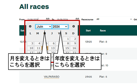 カレンダーが表示されます。左の窓が「月の選択」、右の窓が「年度の選択」なので、今回は2024年6月2日のレースなので、左の窓から「6月(Juin)」を選択。