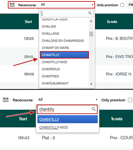 「Racecourse」の窓をクリック。アルファベット順に競馬場名が表示されるので、「CHANTILLY」を選択、または上部枠内に「Chantilly」と打ち込む。