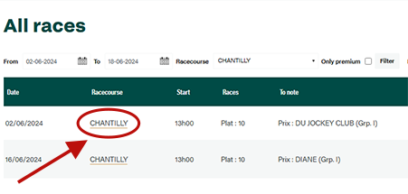 一番上の列に6月2日の開催が表示されるので、その列の「CHANTILLY」をクリック。