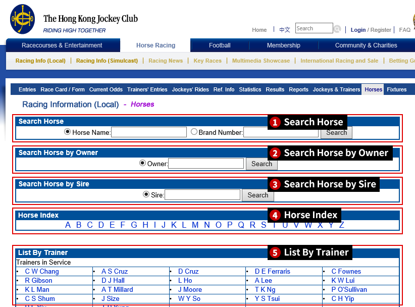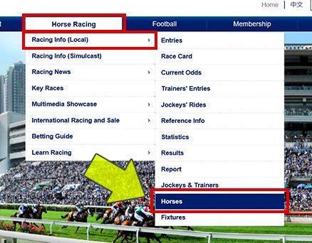 上部のメニュー「Horse Racing」→「Racing Info(Local)」→「Horses」を押す