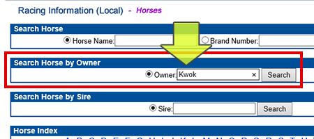 「Owner」入力フィールドに、馬主名(一部でも可)を英語で入力