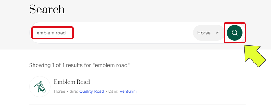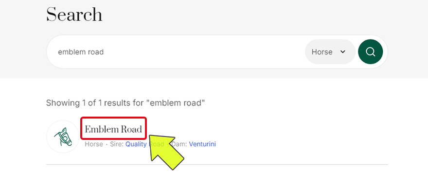 検索窓に「emblem road」と打ち込みます。虫眼鏡マークをクリックすると、「emblem road」という文字列を馬名に含む馬が表示されます。