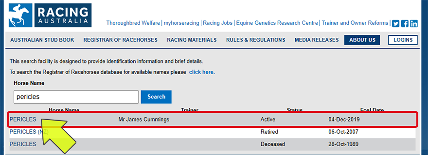 2019年生まれのPERICLESを調べたいので、一番上の「PERICLES」を選択。