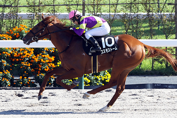 初の芝レースが強敵ぞろいとなった前走の朝日杯フューチュリティS。単勝オッズ297.9倍の15番人気という評価だったが、芝のスピードに臆することなく好位を追走。最後まで懸命に走り抜いて8着に入った。騎乗した秋山稔樹騎手も「芝でもダートでも走れると思います」と話していた。ここまでの2勝は、ダート1000メートルのメイクデビュー小倉とダート1400メートルの1勝クラス・なでしこ賞(京都)だが、前走の走りを見れば芝でも楽しみは十分。祖母が2012年スパーキングレディーC(JpnⅢ)を勝ったスティールパスと、確かな母系も侮れない。馬名の由来は「宇宙(ラテン語)+嵐。嵐を呼ぶ馬」。