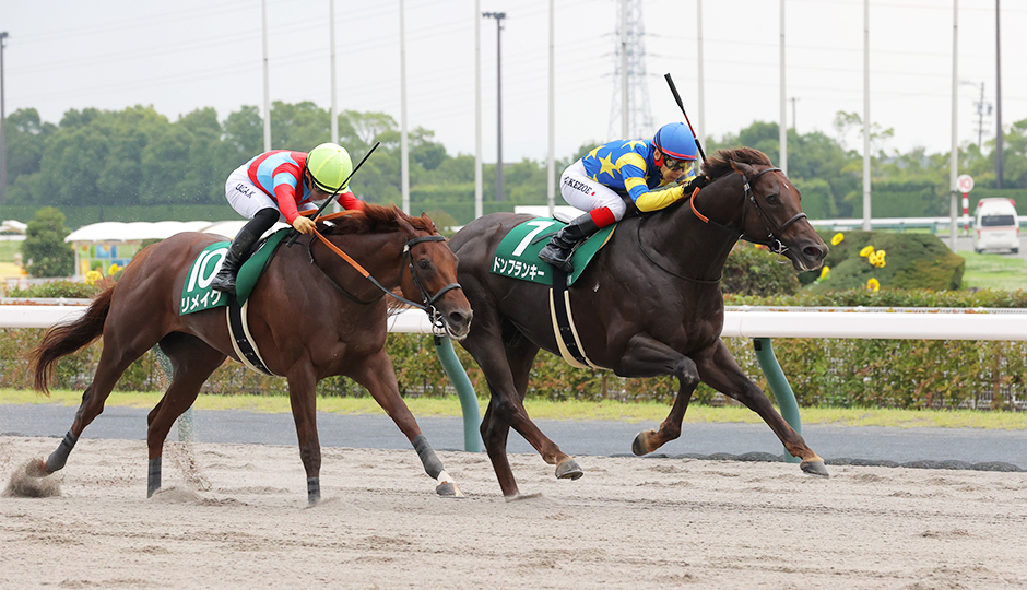 2コーナー奥の引き込み線からのスタートで、3コーナーまでの距離は600メートルほど。そのうち最初の200メートル弱は芝の上を走る。スタート直後は緩やかな上りとなるが、バックストレッチの半ばから緩やかな下りが始まって、下り勾配のまま3コーナーと4コーナーを回る。直線に向くと一転して上り坂が待っている。約160メートルで1.8メートル上る急な坂を越えて、さらに200メートルほど走ってゴールに至る。ゴール前の直線は410.7メートルで、ダートコースとしては東京競馬場に次ぐ長さを誇る。全体としては下って上るコース形態。さらにスタート直後の芝部分でスピードに乗りやすいため、レース前半が速く上がりがかかる「前傾ラップ」になりやすい。スピードだけではなかなか押し切れないタフなコース。