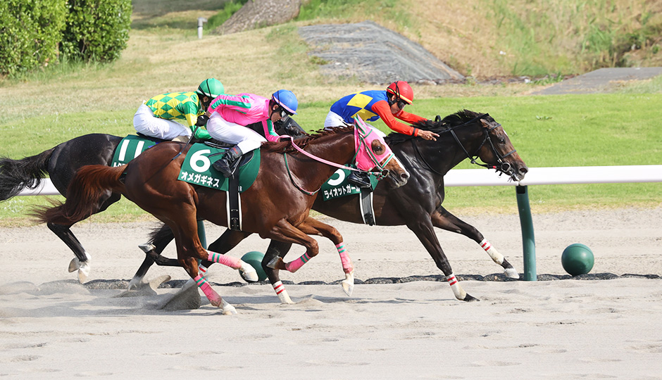 ホームストレッチの入口付近にゲートが置かれて、1コーナーまでの距離は約390メートル。バックストレッチは約400メートルあって、ゴール前の直線は353.9メートル。直線部分の距離はそれぞれ長いが、コース1周の距離自体は1472.5メートルとローカル競馬場としては平均的だ。裏を返せば、各コーナーがタイトでカーブがきついということである。3コーナーへの進入で一旦ブレーキを踏んで、4コーナーから直線に向けて再び加速していく、というレース展開になるので、脚を細かく小出しに使う必要がある。直線距離自体は長いものの、不器用なタイプはトップスピードに乗る前にレースが終わってしまう。機敏に動ける立ち回りの上手さが求められるコースだ。