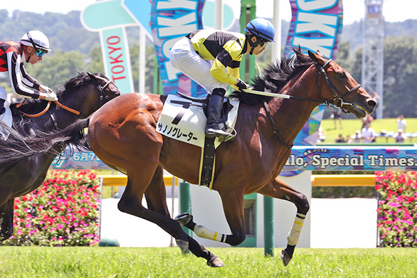 6月22日のメイクデビュー東京(芝1600メートル)は、出脚がつかず、スッと控えて後方待機策。4コーナーから徐々に外へ持ち出されると、レースの上がり3ハロンタイムを1秒2上回る33秒9(推定)の末脚で一完歩ごとに差を詰め、ゴール寸前で逃げ粘るマゲバスピードを捕らえて勝利を飾った。デビュー時は坂路のみの追い切りだったが、この中間はウッドチップコース併用で攻めを強化し、状態面の上積みは十分。ここは重賞で素質馬がそろったが、父グレーターロンドン譲りの瞬発力を秘めており、有力候補の一頭に挙げられる。