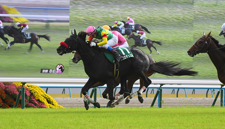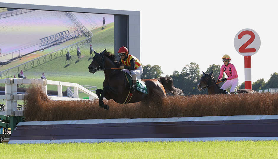ホームストレッチ入口からスタートしてコースを2周するレイアウト。1周目の3コーナーでは、重賞だけで使用される大障害コースに入っていく。いけ垣を飛越すると、直後に待ち構えるのが高低差0.8メートル、長さ15.9メートルのバンケット障害だ。台に飛び乗って、歩幅を合わせて飛び下りる。「3段跳び」とも言われる独特の障害は他に見られないもので、京都競馬場ならではの難所になっている。最後は平地の芝コースに合流するが、直線半ばには可動式のハードル障害が設置されていて、各馬は最後の力を振り絞ってゴールを目指す。障害の数は15。比較的距離が短いのでスピードが必要とされるが、リズムを崩さずに障害をクリアするセンスも問われる。