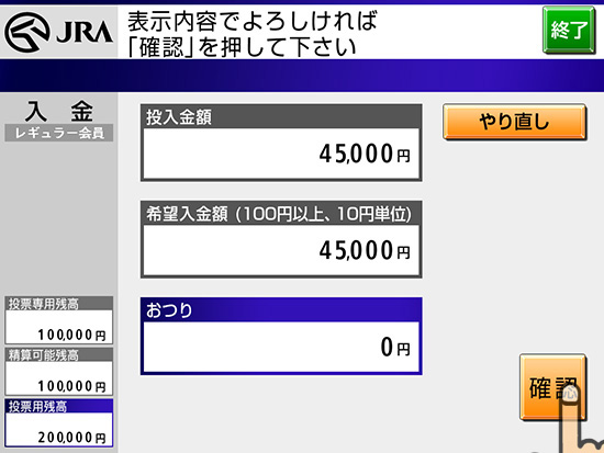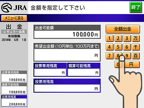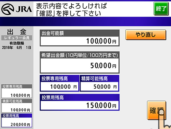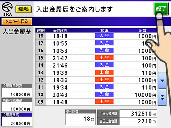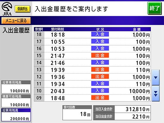 UMACA投票機や入出金機で、当日の投票履歴や当該週の入出金履歴を確認できます。