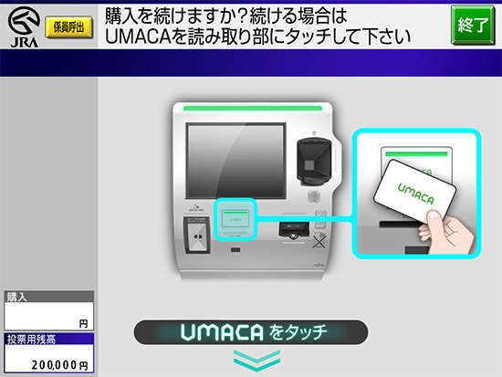 続けて購入する場合はUMACAを読み取り部にタッチしてください。終了する場合は「終了」を押してください。