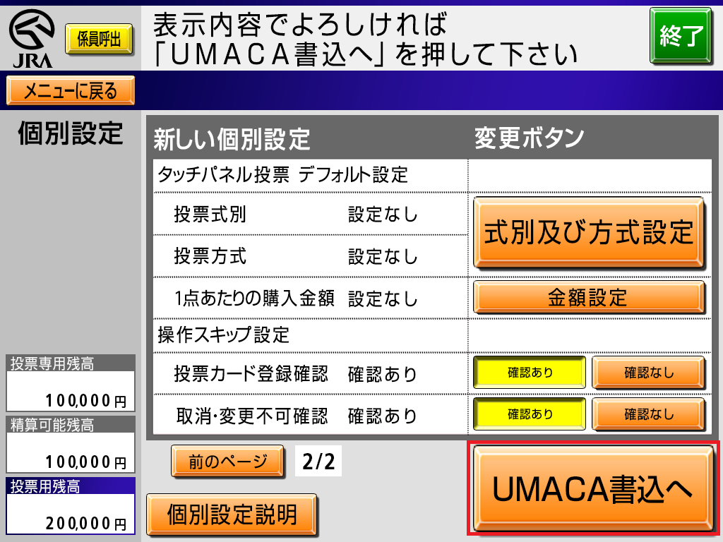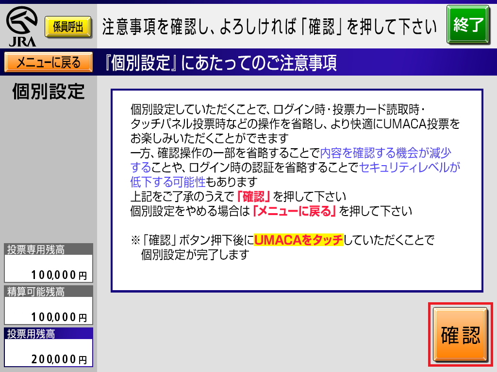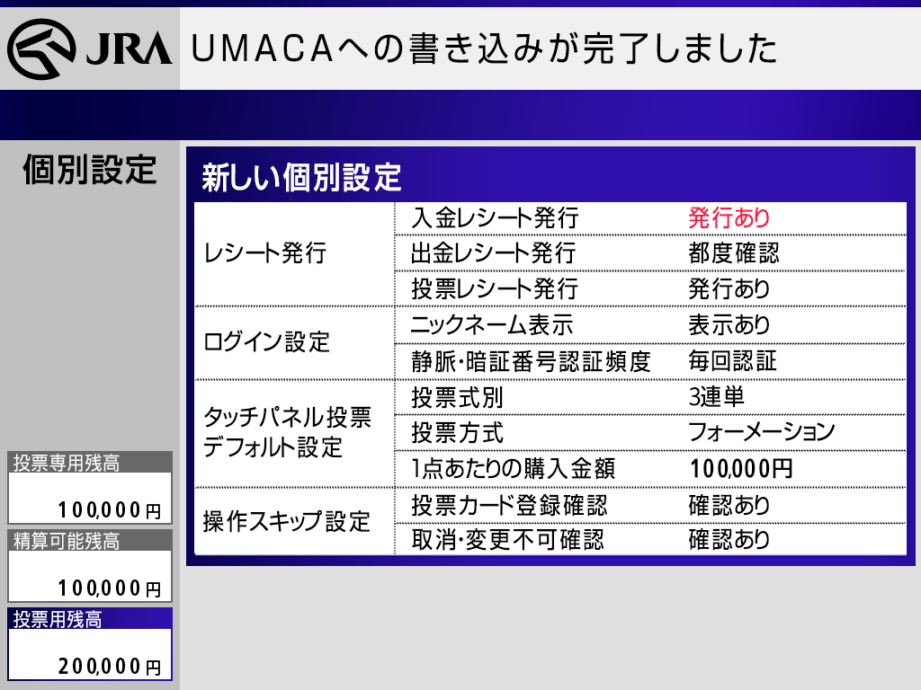 UMACAで購入する際、ログイン時の認証頻度やマークカードの登録・取消・変更不可の確認省略など、お客様のお好みで設定できます。 個別設定をすれば毎回のログインがもっとスムーズにできるほか、購入スピードがアップするなど、いいことたくさん!お気に入りの設定にカスタマイズして、より便利に楽しくUMACAをご利用ください!