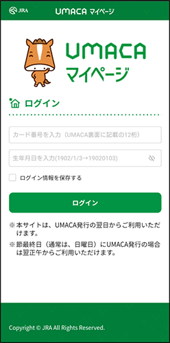 • UMACAカード番号、生年月日を入力しログインボタンを押してください。