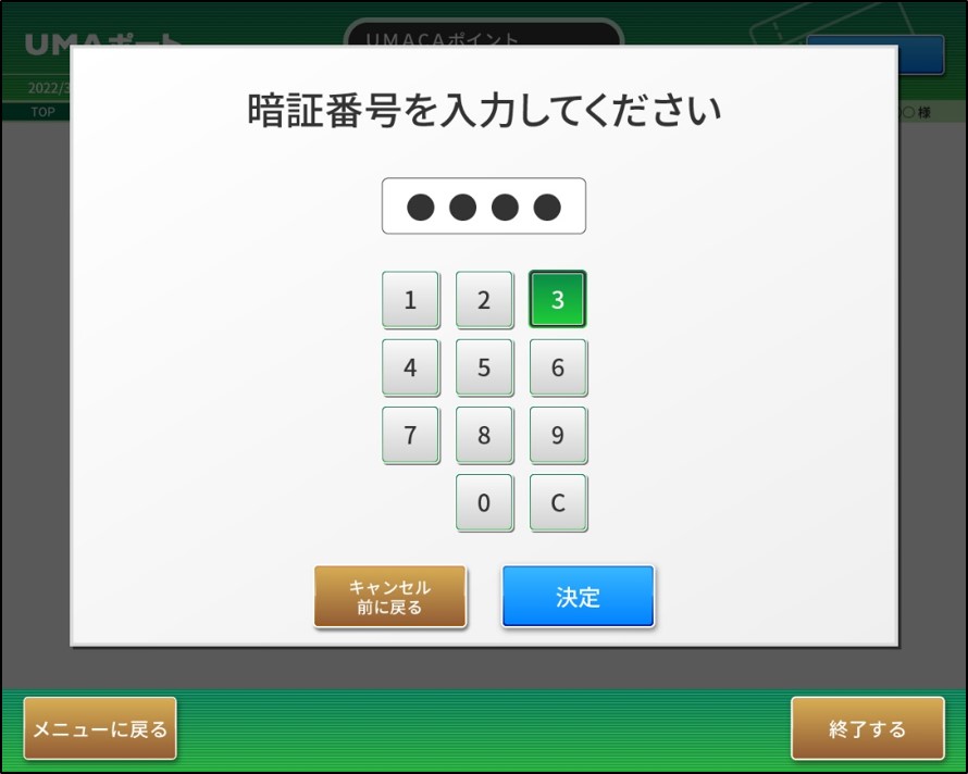 なお、ポイントの利用には、UMACAご登録時に設定した(暗証番号を変更した場合は、再設定した)暗証番号(4桁)が必要です。