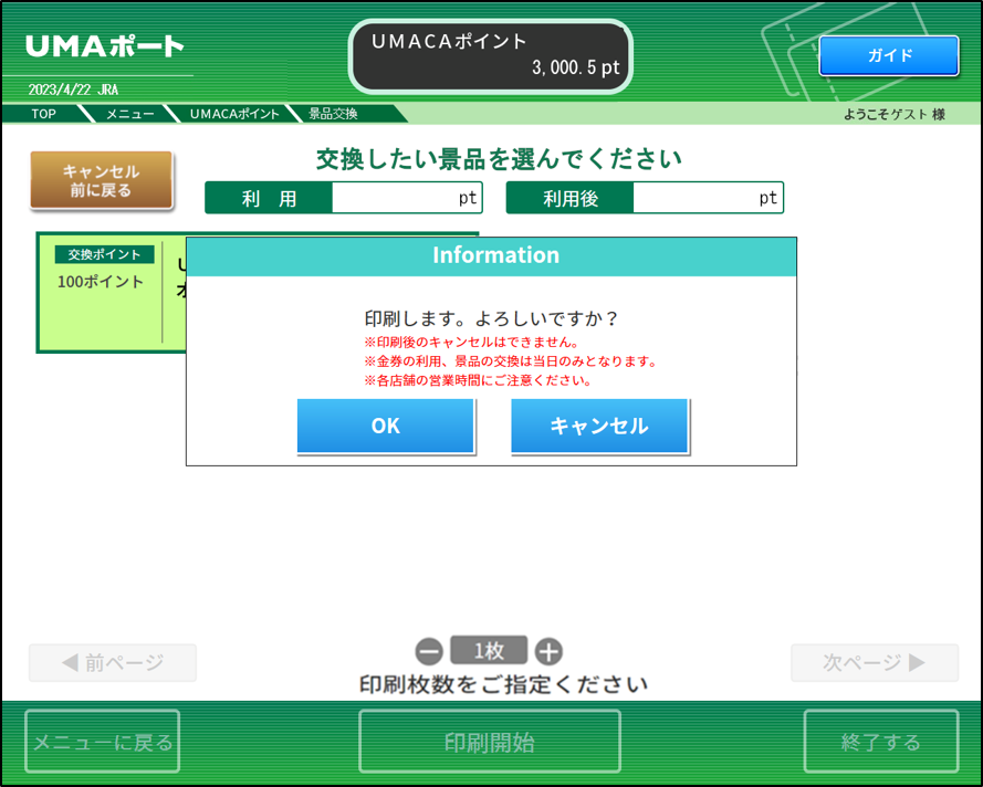 • 「OK」ボタンを押し、引換券(ポイント交換)を印刷してください。