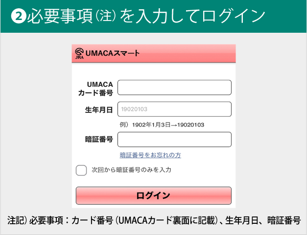 すでにUMACA会員の方は、UMACAスマートログイン画面で、カード番号等必要な情報を入力すれば、すぐにご利用いただけます。