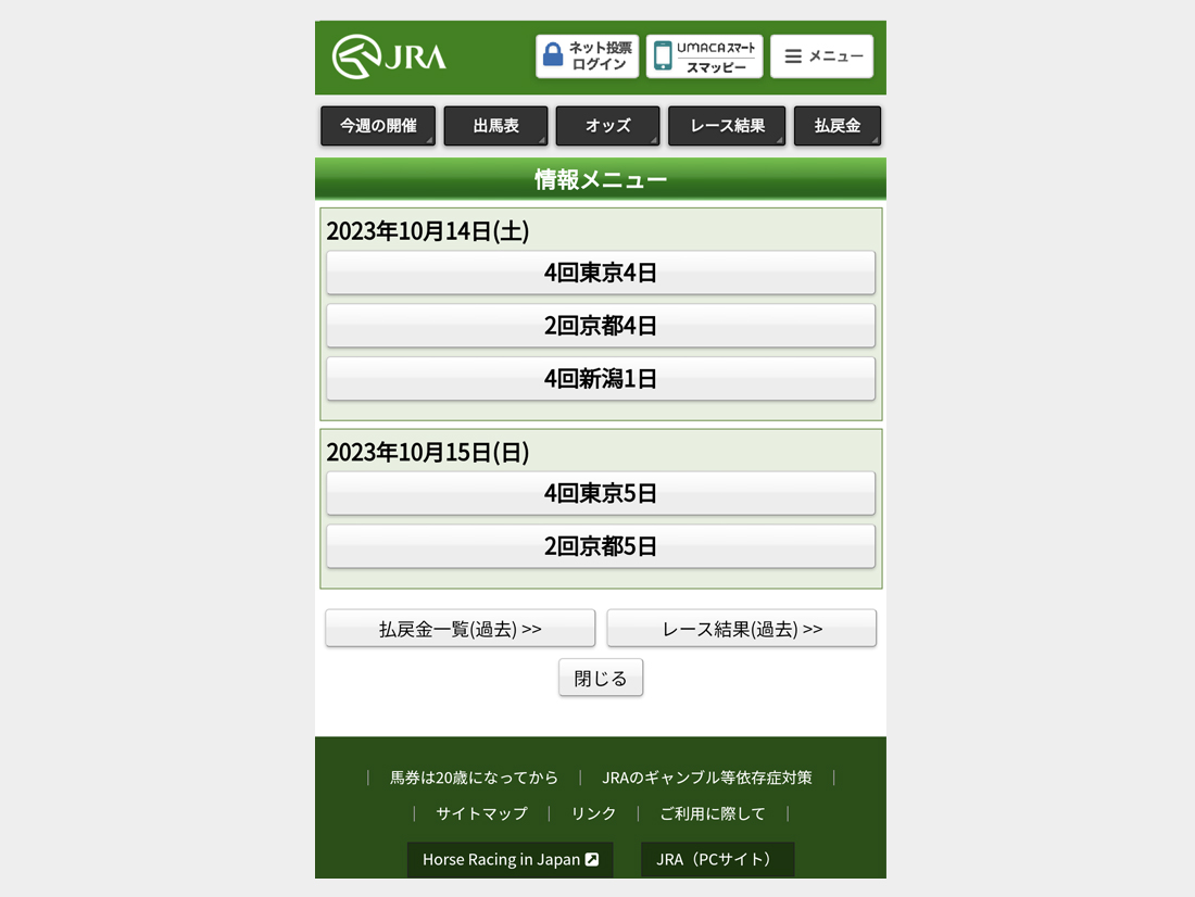 注記)UMACAで購入したすべての履歴(購入後60日間)が確認できます。その他、オッズやレース結果を確認できる情報メニューもあります。