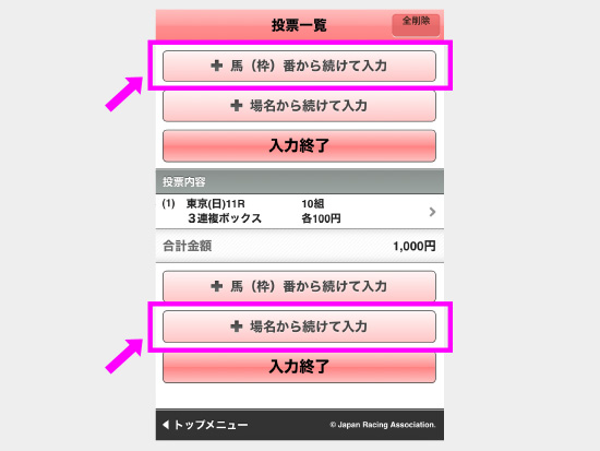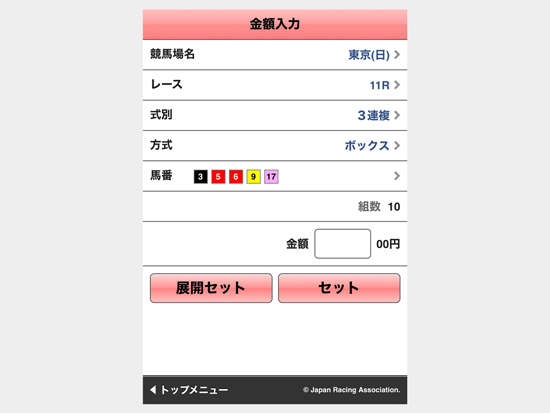 馬番を選択したら「次へ」をタップし、最後に「金額入力画面へ」をタップしてください。