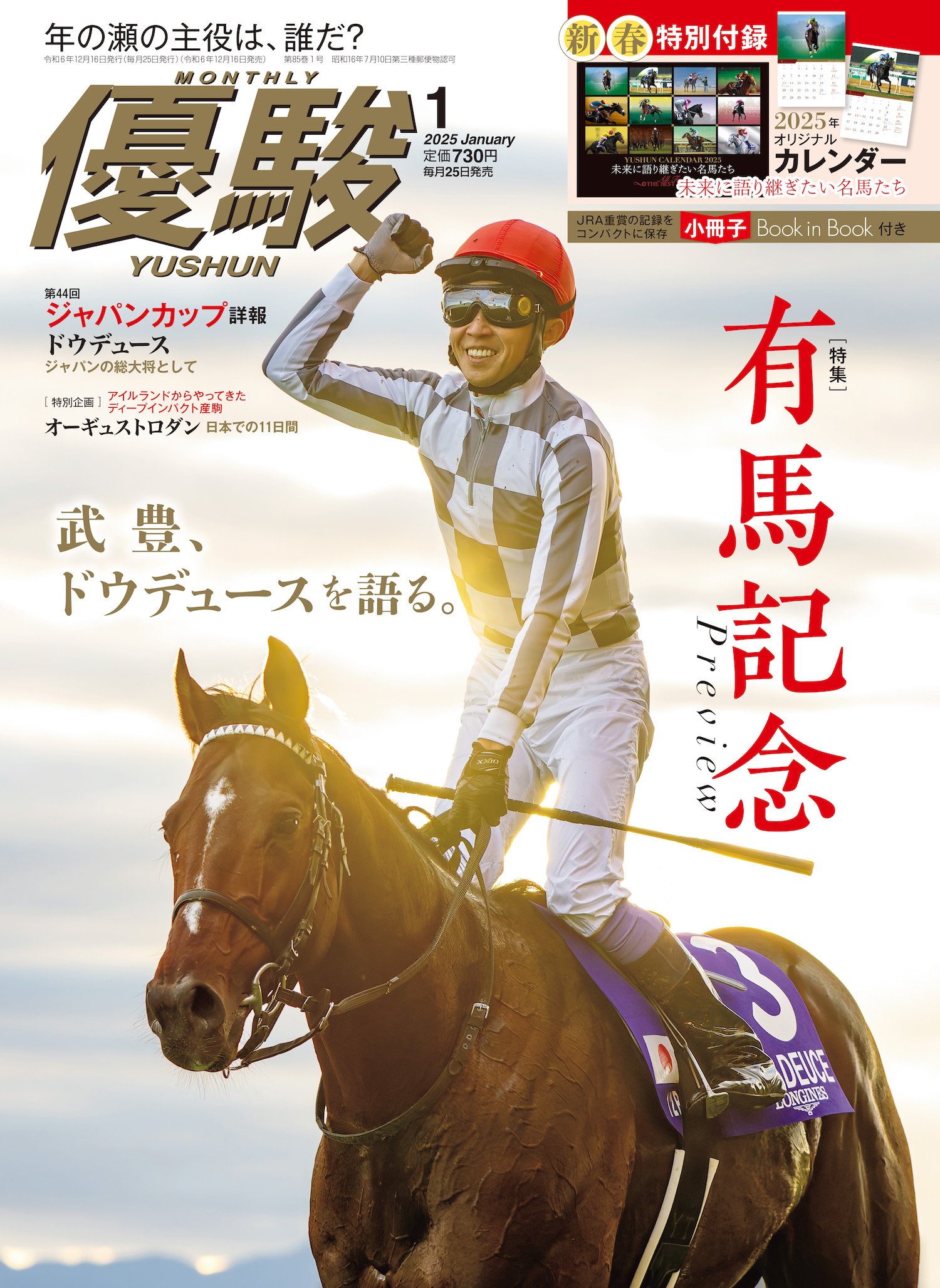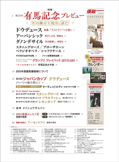 12月16日(月曜)発行のJRA機関誌『優駿』2025年1月号は、目前に迫った第69回有馬記念を特集。ラストランに臨むドウデュースをはじめとした出走予定馬の紹介や、過去10年のグランプリを振り返る記事を通して、年の瀬の大一番を展望します。