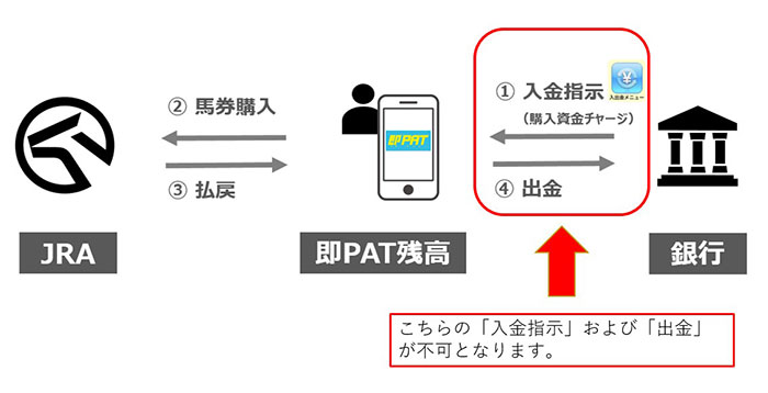 2025年1月13日(祝日・月曜)の12時05分までの馬券購入資金については、1月12日(日曜)の20時55分までに即PATの「入金指示」操作からご入金ください。それまでに即PATへのご入金がないと1月13日(祝日・月曜)の12時05分までの馬券の購入も不可となりますので、ご注意ください。