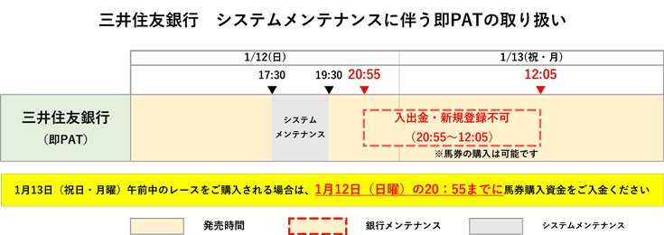 銀行のシステムメンテナンスに伴い、2025年1月12日(日曜)20時55分から13日(祝日・月曜)12時05分まで、即PATの「入金指示(購入資金のチャージ)」および「出金(指示)」が一切不可となります(同時間帯は、三井住友銀行の即PAT新規登録もできません)。