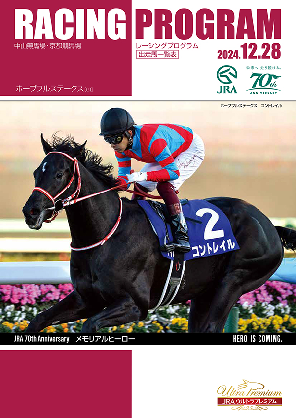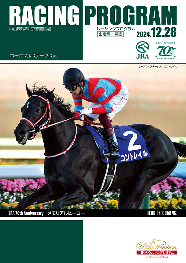 本年のGⅠ競走当日のレーシングプログラムはJRA創立70周年を記念し、昨年のファン投票で「メモリアルヒーロー」に選出された名馬を特集するカラー豪華版となります。 12月28日(土曜)はホープフルステークス!特集馬はコントレイルです! どうぞお楽しみに!