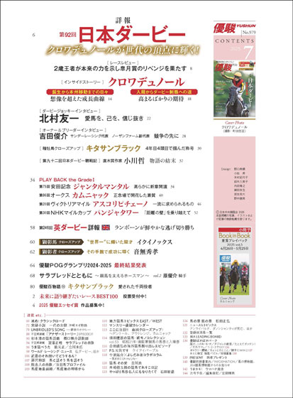 6月25日(水曜)発売のJRA機関誌『優駿』7月号は、クロワデュノールが世代の頂点に輝いた第92回日本ダービーを詳報します。レースレビューを始め、クロワデュノールの誕生からダービー制覇までの道のり、大ケガを乗り越えてダービージョッキーとなった北村友一騎手のインタビュー、直木賞作家の小川哲さんによる観戦記など、多彩な切り口から競馬の祭典を振り返ります。