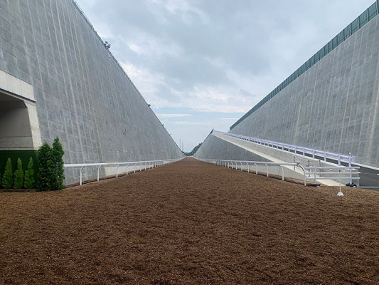 マイクロバスで坂路コース・発走試験用ゲート・ウニモグ駐車場等を巡り、見学していただきます。