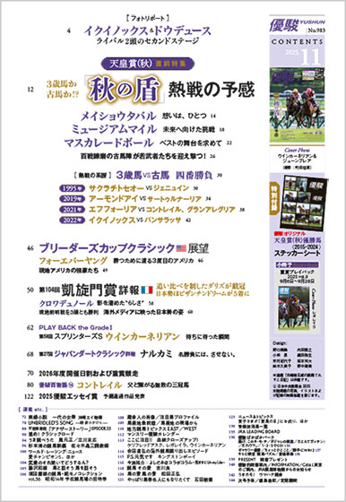 昨年の雪辱に燃えるフォーエバーヤングが出走を予定しているブリーダーズカップクラシックの展望記事や、日本調教馬3頭が出走した凱旋門賞の詳報も掲載しています。
