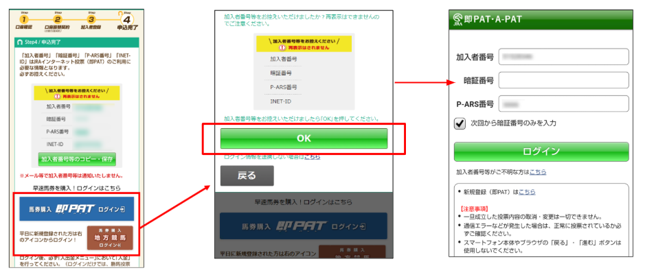 即PATおよびJRAダイレクト新規登録完了後、「申込完了」画面からログイン画面に遷移する際に「加入者番号(利用者番号)」「P-ARS番号」が自動的に入力されます。