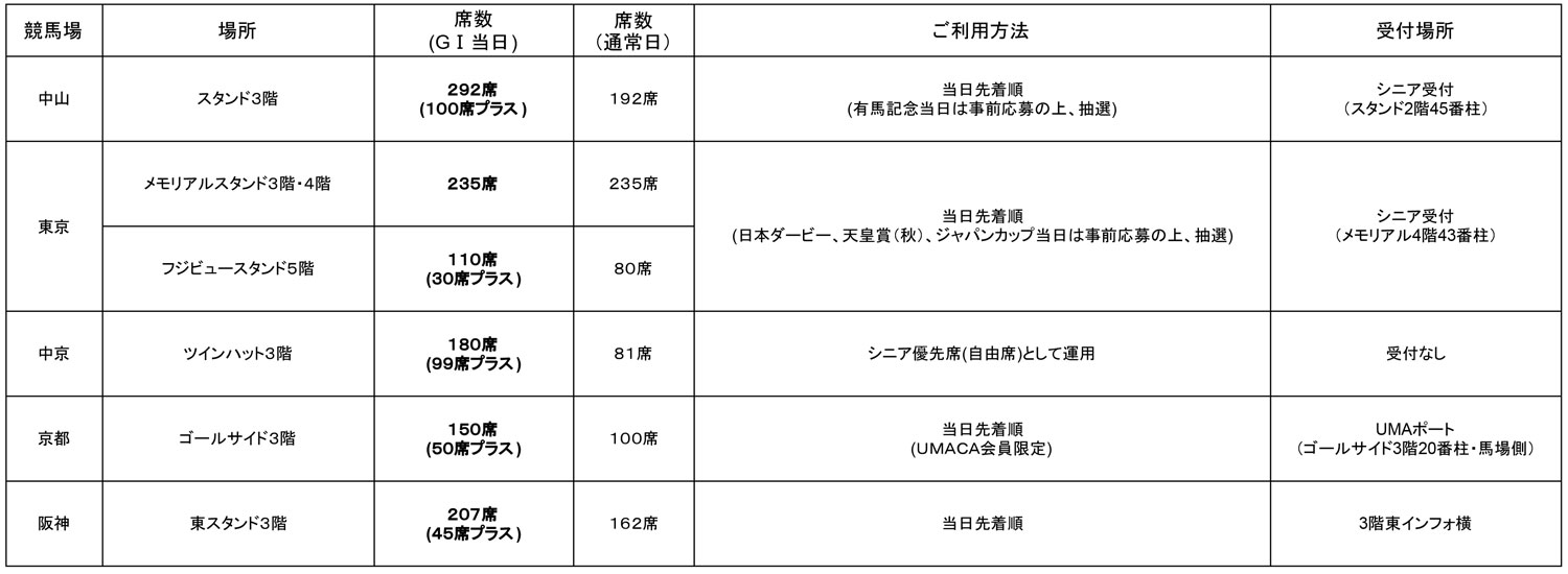 競馬場の「シニアシート」について、2026年も引き続きGⅠレースが実施される競馬場におきまして、座ってゆっくりとくつろいで競馬観戦していただけるよう、ご利用いただける座席数を大幅に拡大します。ぜひ、ご利用ください。