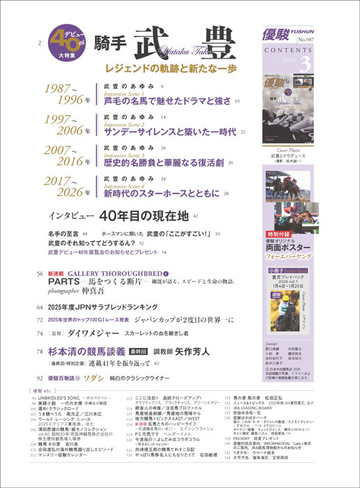 サラブレッドの魅力を切り取った連載写真企画もスタート。このほか、2025年度のJPNサラブレッドランキングやジャパンカップが2度目の世界一となった世界のトップ100GⅠレースの読み物、ダイワメジャーの追悼記事、41年続いた「杉本清の競馬談義」の最終回など、充実の内容です。