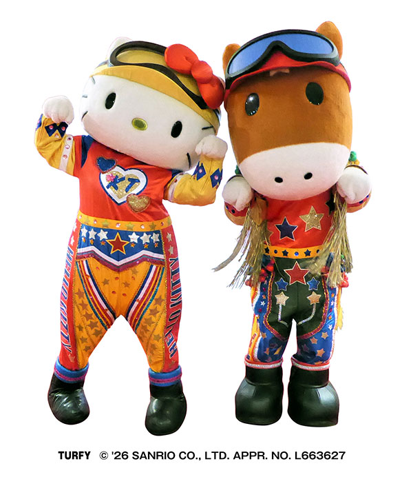 JRAマスコットキャラクターの「ターフィー」と、お友達の「ハローキティ」が遊びにきます。